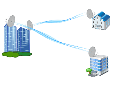 Популярным вариантом беспроводного подключения является организация Wi-Fi моста между объектом подключения и источником интернета (излучателем), который в свою очередь подключается к сети уже проводом. Тут стоит отметить, что важной особенностью является организация именно источника, т.е. установка оборудование, которое будет транслировать Wi-Fi сигнал в эфир. Если с принимающей сторойно в принципе всё ясно, то вот с передающей могут возникнуть проблемы. Как правило, передающее Wi-Fi-оборудование устанавливается на многоэтажках на максимальной высоте, чтобы избежать возможных помех в передаче Wi-Fi сигнала. Такой объект ещё нужно найти, договориться с хозяином, с ТСЖ, с управляющей компанией и т.д., при необходимости согласовать установку излучателя с другими организациями (пожарники, МЧС, телевизионщики, электрокомпании и т.д.). Далее необходимо обеспечить бесперебойное питание оборудование, а также надлежащую защиту от кражи и взлома. Кроме того, важным условием является выбор частного диапазона Wi-Fi для организации канала. Стандартный диапазон 2,4 ГГц, в особенности в многоэтажках, сильно загружен, что приводит к шуму эфира, соответственно к снижению качества сигнала и скорости интернета. Использование диапазона 5 ГГц регламентируется Государственной Комиссией по Радиочастотам (ГРКЧ), соответственно нужно получить разрешение и зарегистрировать приёмо-передающее оборудование. Есть ещё специфические Wi-Fi диапазоны типа 3 ГГц, 6 ГГц, однако и в них тоже могут возникнуть сложности. Прежде всего с оборудованием, т.к. под специфические диапазоны не всегда можно найти приёмники, передатчики, антенны и другое оборудование. Кроме того, надо понимать, что чем выше частота, тем хуже проницаемость сигнала и соответственно дальность действия системы. Таким образом, в случае решения всех организационных задач, а также наличия изначального проводного канала, при организации Wi-Fi моста можно получить достаточно высокую скорость интернета на объекте. Расстояние от передающего до принимающего устройства может достигать 10-15 км (в случае прямой видимости).